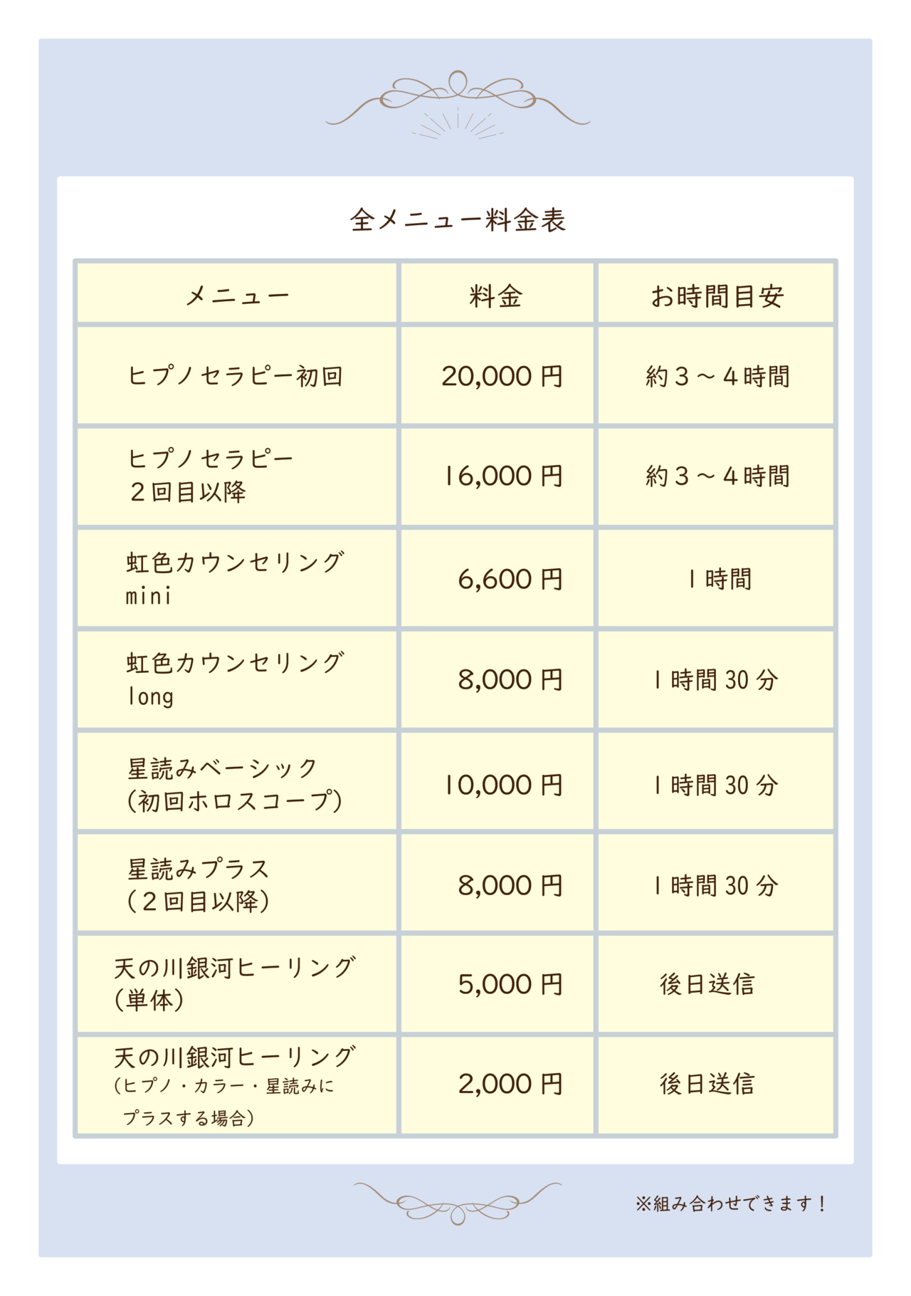 基本的なおすすめは「ヒプノセラピー&天の川ヒーリング」ですが、他にも面白い組み合わせがたくさん!