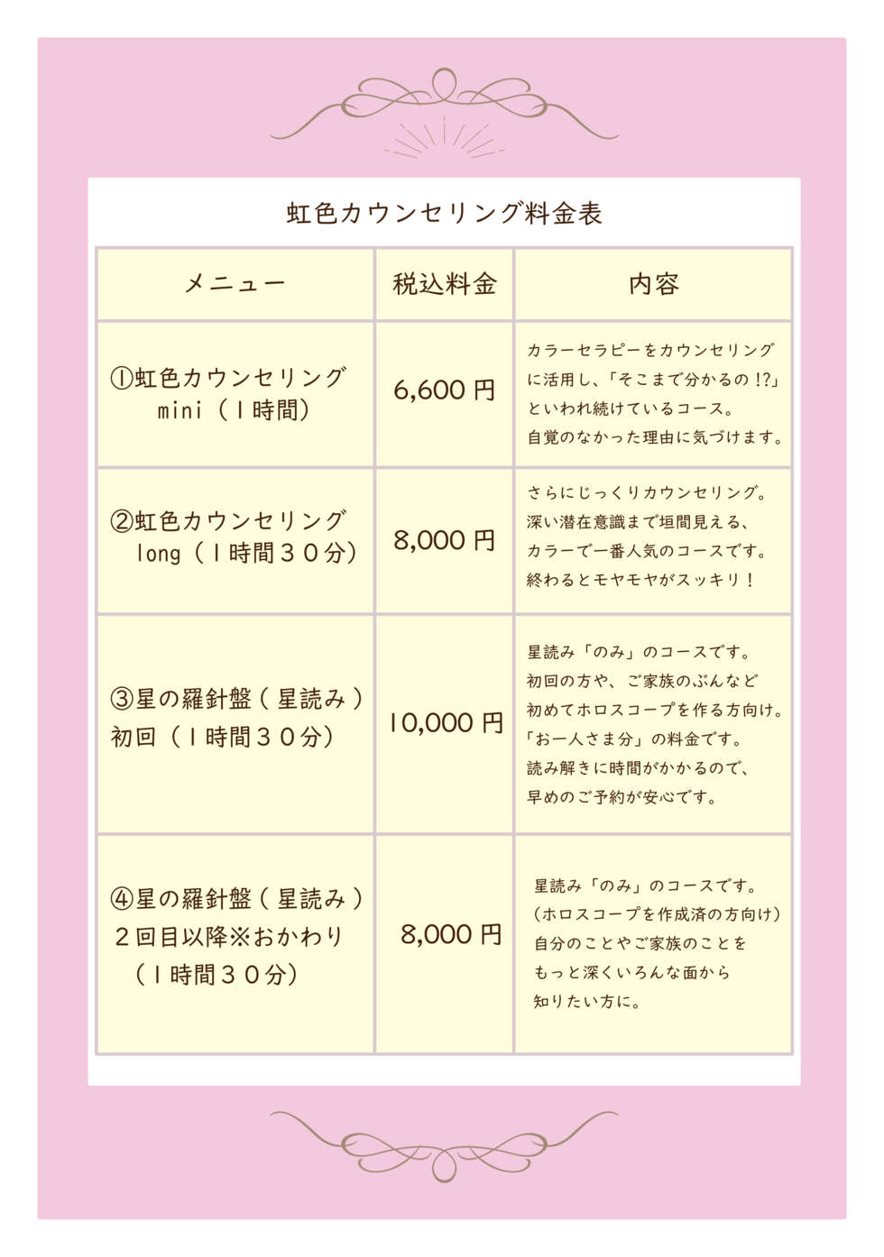 ※「おかわり」つまり2回目以降は、ご両親やパートナーの方などのホロスコープを読むことも可能です。相性占いではなく、「あなたが、相手を深く知るため」の手段であるとご了承ください(ただしお子さんの未来はこれから自分で考え、成長しつつ創り上げていくものですので、中学生以下の方は行いません)。